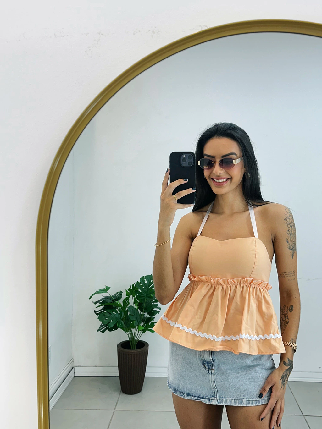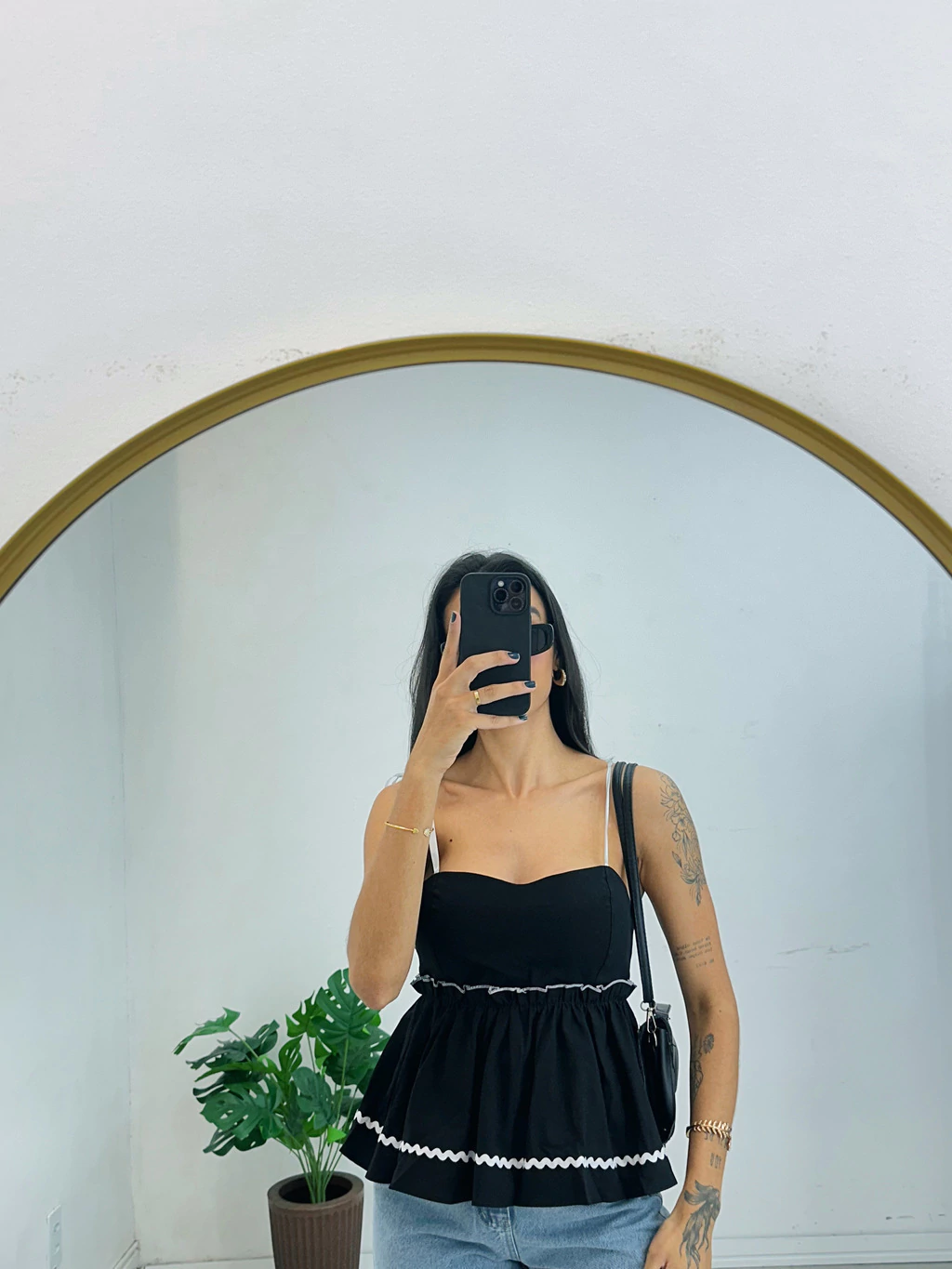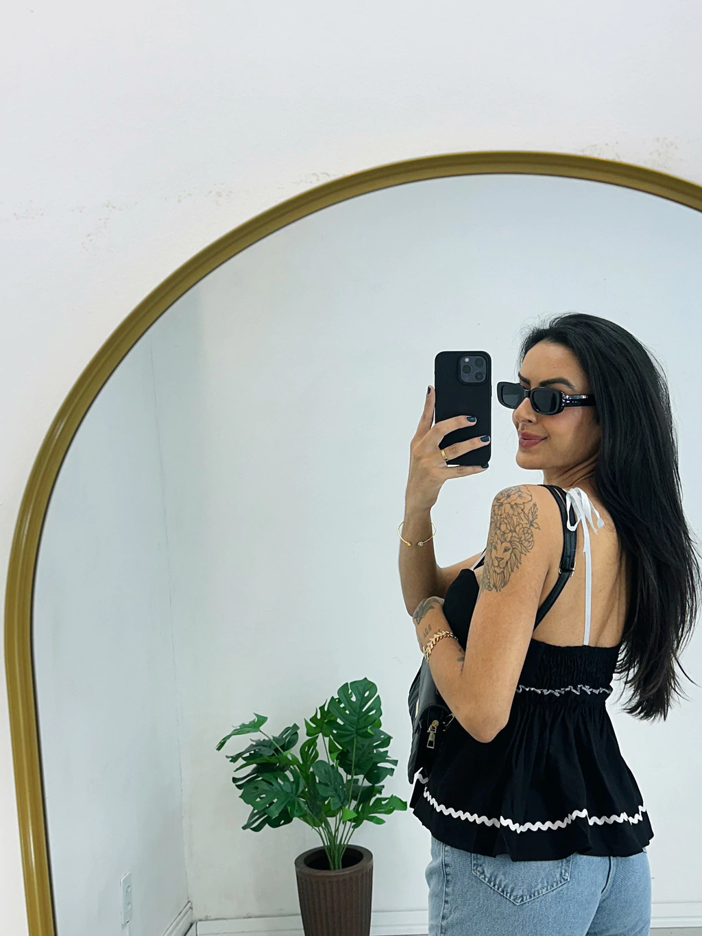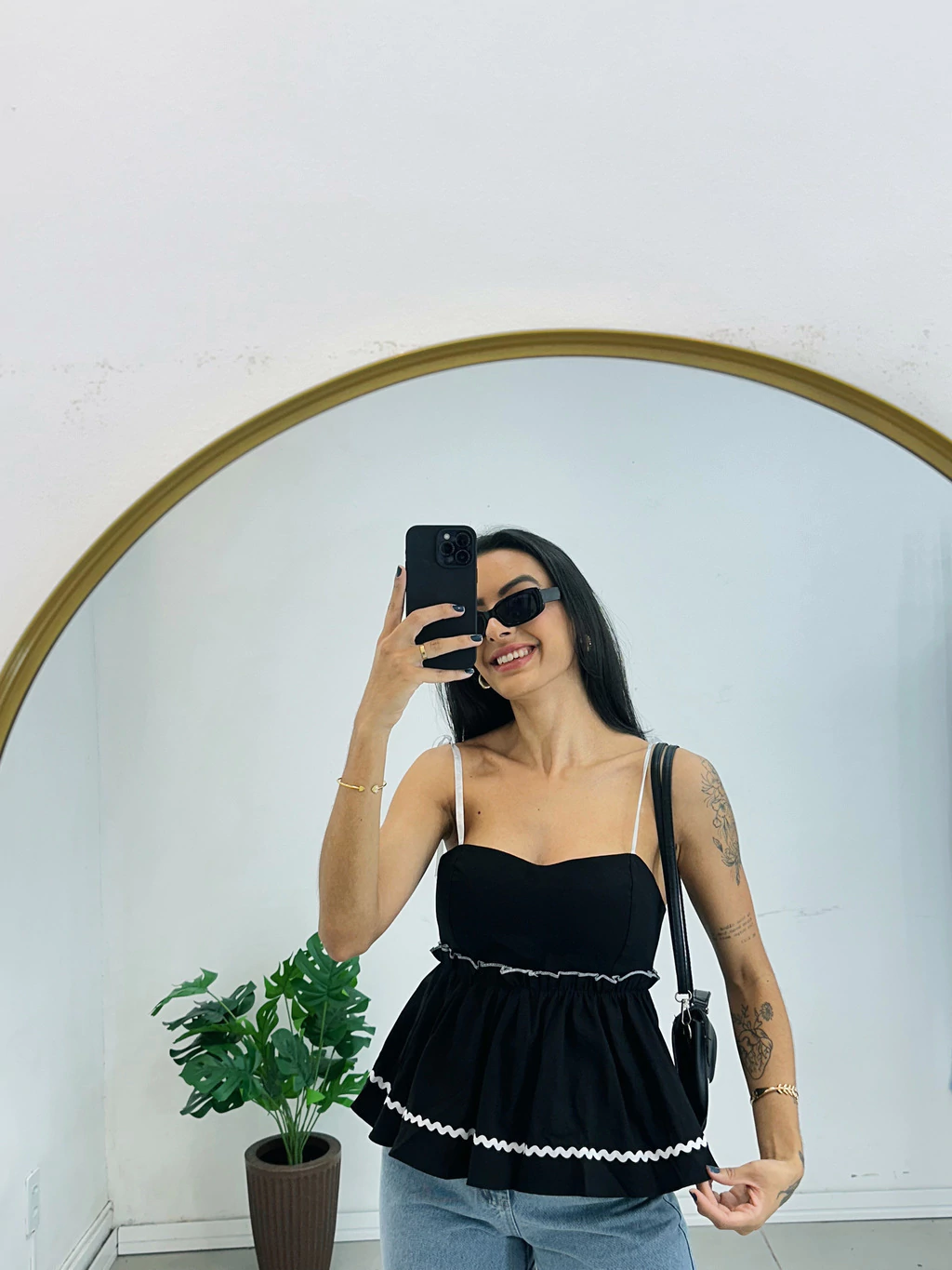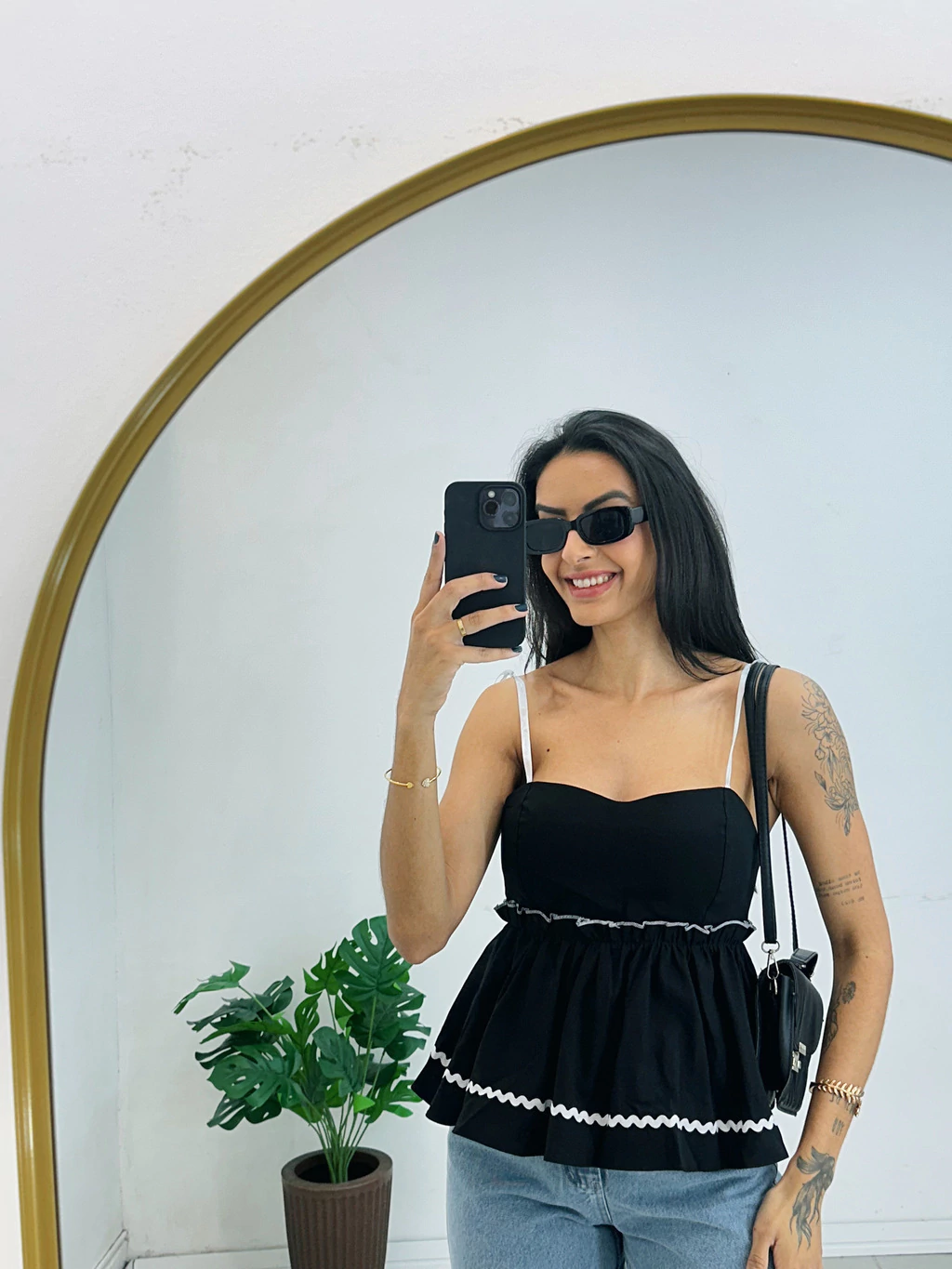 Com ajuste na alcinha e bojo integrado, a bata oferece sustentação e modela o busto com delicadeza, valorizando a silhueta. O detalhe da duplinha no busto adiciona charme extra, enquanto o caimento peplum cria uma silhueta feminina e elegante.