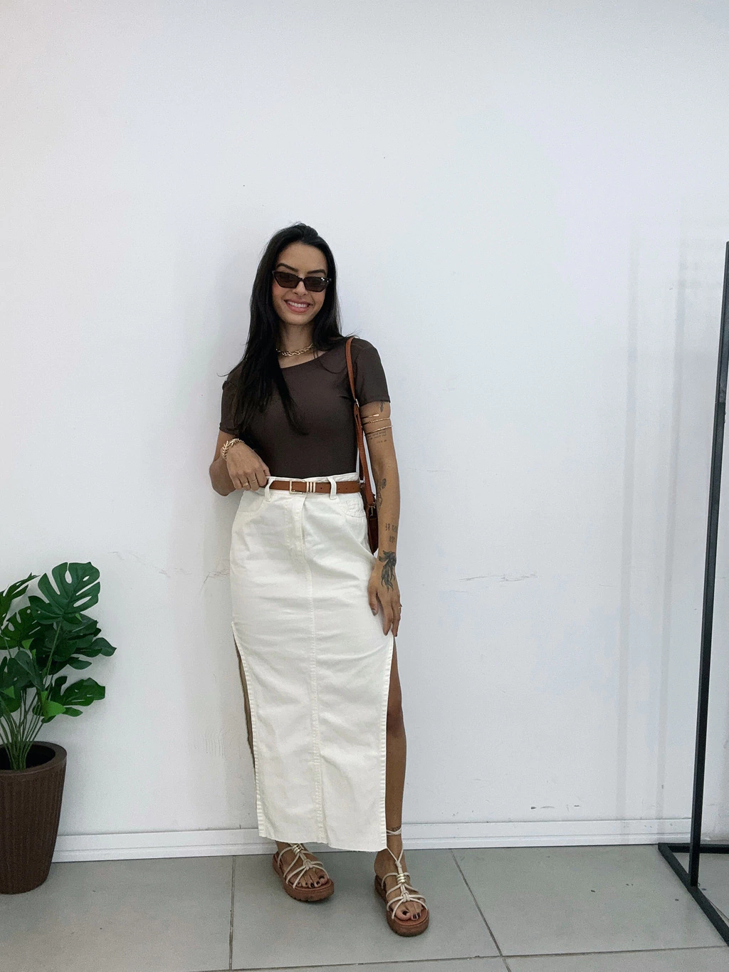Confeccionada em jeans de alta qualidade, nossa saia midi off traz uma modelagem elegante com uma fenda lateral que realça a feminilidade e proporciona conforto ao caminhar. Perfeita para quem busca um visual moderno e cheio de personalidade, ela combina facilmente com blusas básicas ou peças mais sofisticadas.