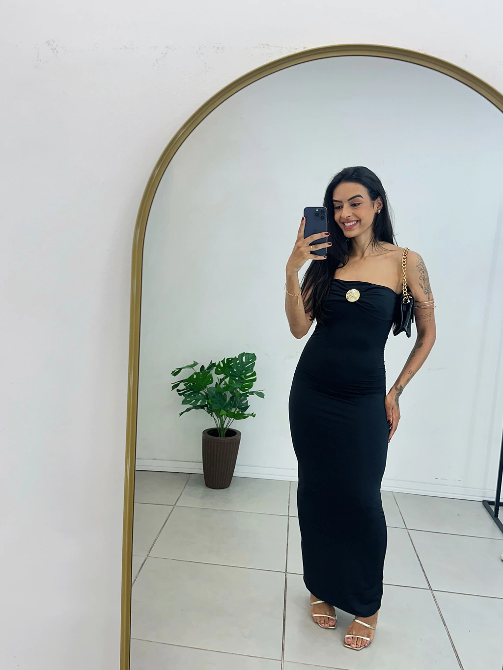 O design apresenta um charmoso detalhe de sobreposição e aviamento dourado no busto, que adiciona um toque de sofisticação único. Além disso, o leve drapeado na cintura realça a silhueta, valorizando sua beleza natural.