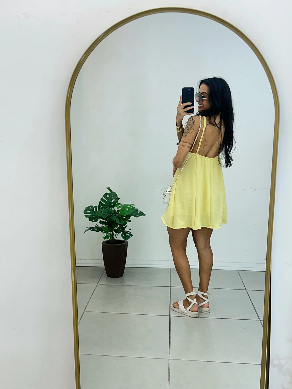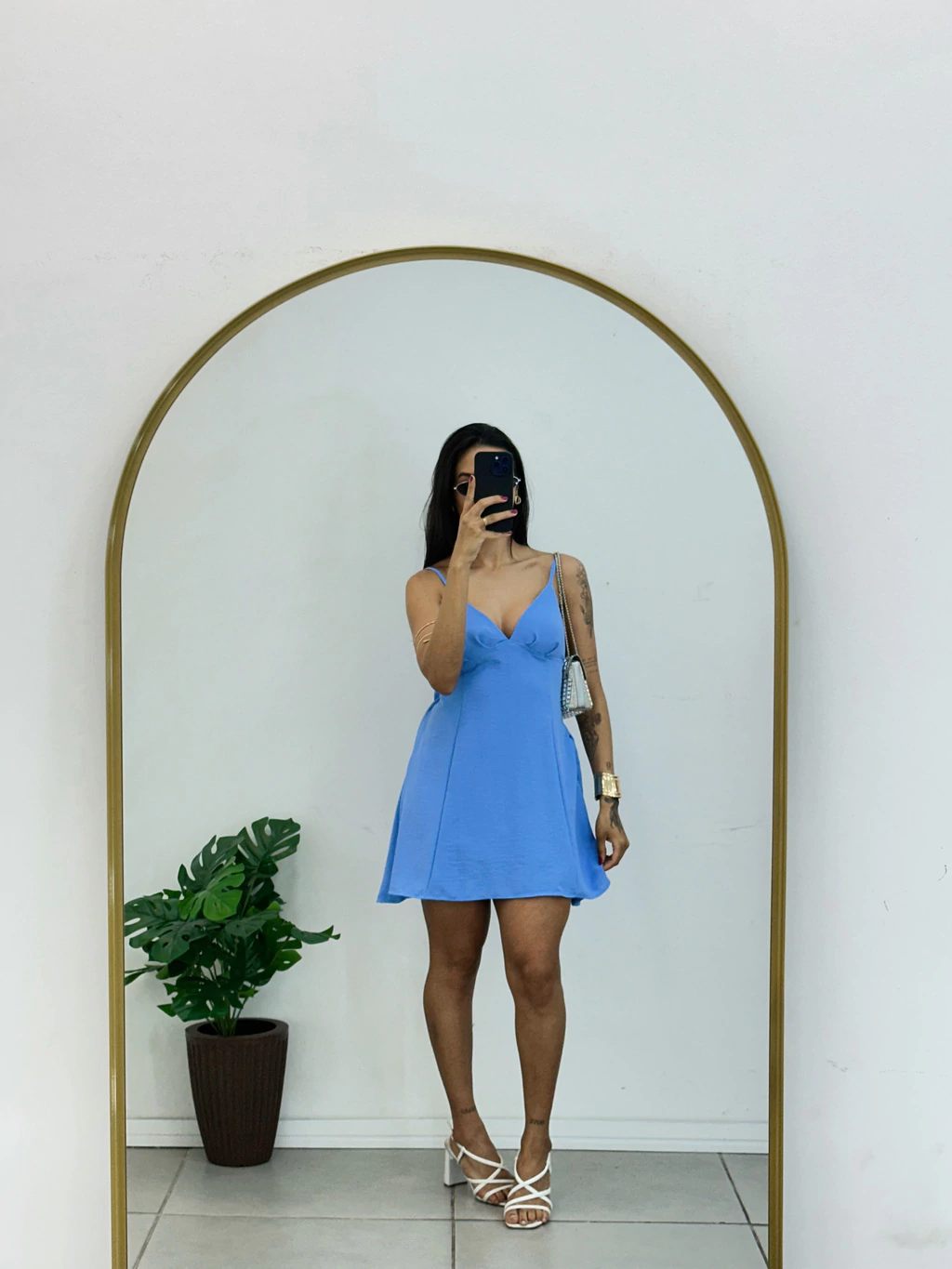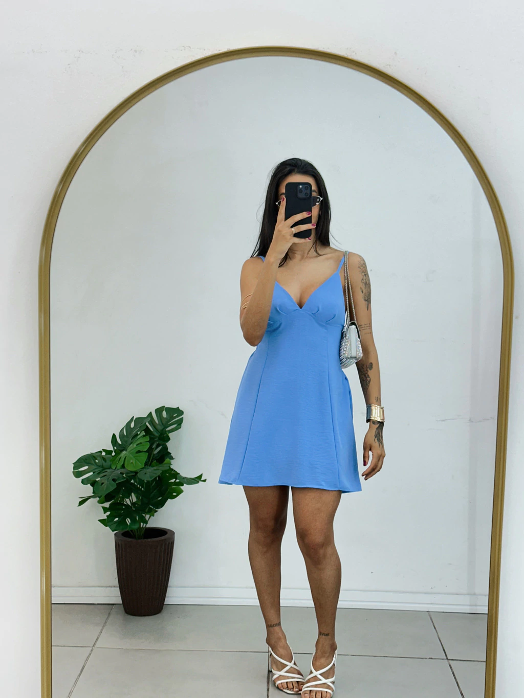 Este vestido curto na medida certa destaca-se pelo decote singelo que valoriza sua elegância sem exageros. O ajuste delicado na alcinha permite que você personalize o caimento, garantindo conforto e um toque feminino.